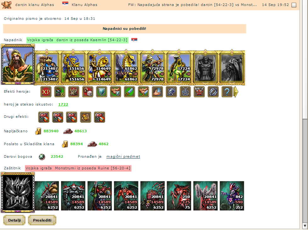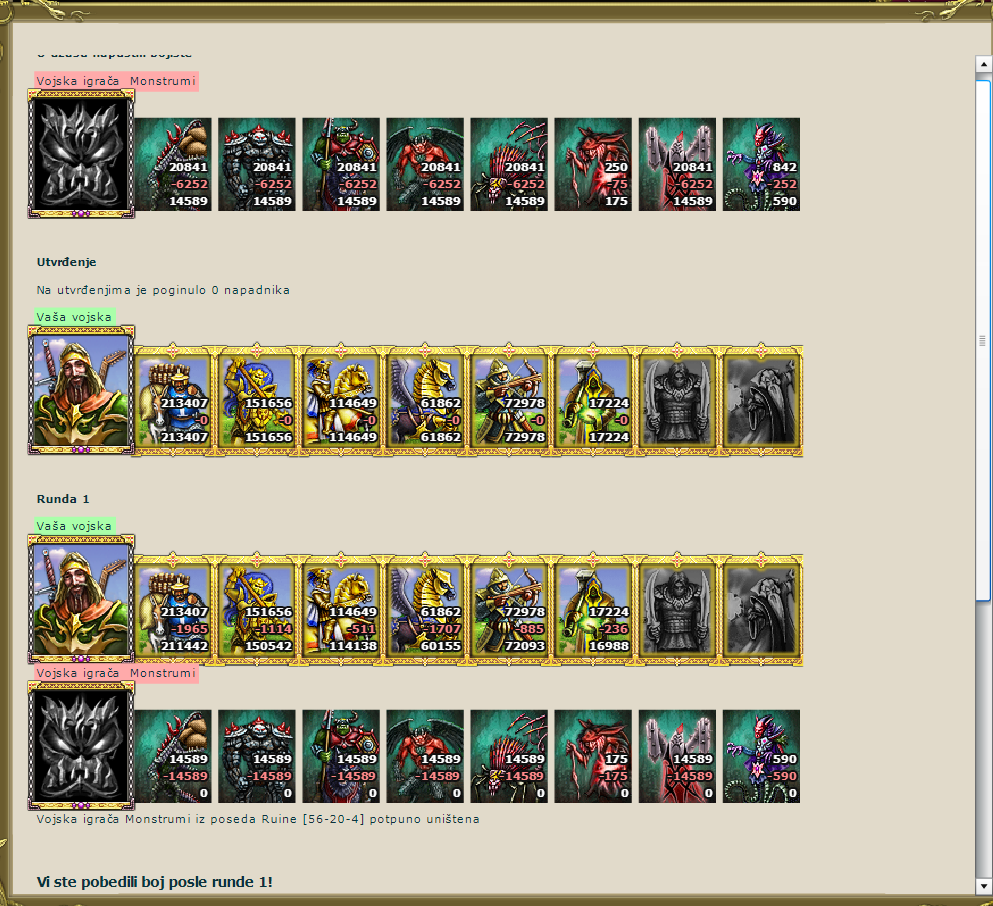 Krece moja neustrasiva konjica ,gazi preko neprijateljske pesadije,,gazi sve pred sobom,,,vesto izbegavaju neprijateljske letece snage koje su pod neprestanom vatrom mojih strelaca ,,samostreli ispaljuju rafalnom paljbom strele.Neeprijateljska leteca armada je unistena ,,,moja konjica ima otvoren put ka centru monstrumskog logora.Pesadija je krenula svom silinom i unistava ono malo neprijatelje sto je prezivelo napad pegaza,smrtonosne strelce i neumoljivu konjicu,,nekolicina lekara pada od umora , srecom tu su mladi i svezi vidovnjaci koji lece i njih i nesto ranjenika donesenih iz prvih borbenih redova .Polako odmice noc , a moja vojska je pragu velike pobede.Monstrumima nepomaze nikakva magija da se izvuku iz smrtne klopke u koju su upali.Dolazi moj zapovednik na raydraganom vrancu.*Gospodaru protivnicka vojska panicno bezi i napusta bojiste , ostavljajuci brdo bisera*iIstog trena krecu marljivi nosaci da pokupe rasuto balgo koje su montrumi ostavili u panicnom begu.sSa bojista moji lekari izvlace i poslednjeg ranjenika , vracajuci u borbenu gotovost. Bitka je dobijena bez gubitaka!!!!