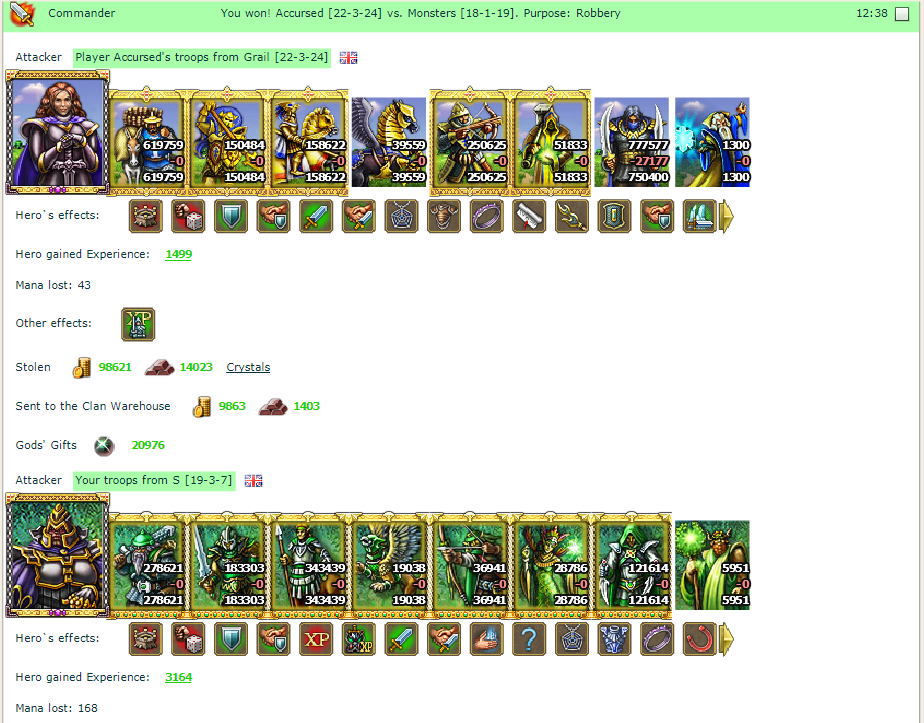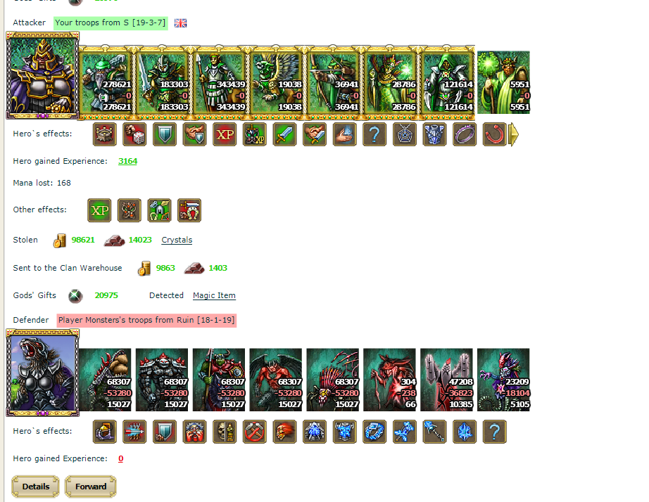 And now the ruler of monsters was struck by the spear of the brave hero Fundising. The remains of monsters after seeing the death of their ruler rushed to run away, leaving in possession of crystals and black pearls. Healers began to work, they managed to resurrect almost all the fallen in battle. Heroes of the rulers Nika396 and Accursed honestly shared the spoils. Tired, but with victory and prey troops returned to their hometowns. Invaluable experience was gained in this brutal battle. The news of the glorious battle instantly spread into the taverns of other kingdoms. The glorious ruler nadzirateldemon sent gifts to the winners. Many rulers sent messengers with congratulations. Three days lasted a feast about the great victory over monsters. There were a lot of songs that are sung now. Even the Gods promised to reward the winners with valuable artifacts.